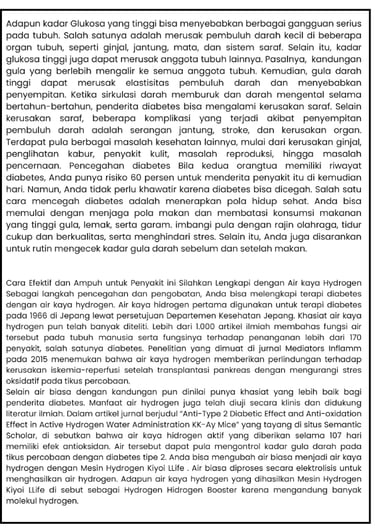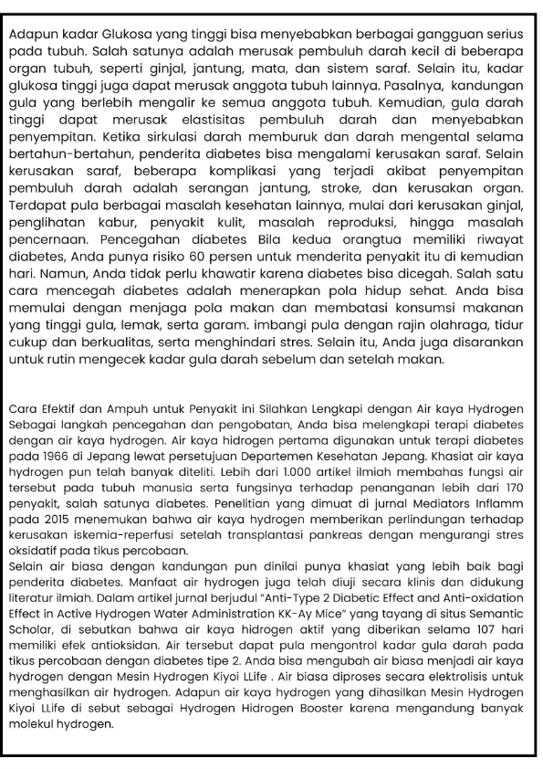 Cara Efektif dan Ampuh untuk Penyakit ini Silahkan Lengkapi dengan Air kaya Hydrogen Sebagai langkah pencegahan dan pengobatan, Anda bisa melengkapi terapi diabetes dengan air kaya hydrogen. Air kaya hidrogen pertama digunakan untuk terapi diabetes pada 1966 di Jepang lewat persetujuan Departemen Kesehatan Jepang. Khasiat air kaya hydrogen pun telah banyak diteliti. Lebih dari 1.000 artikel ilmiah membahas fungsi air tersebut pada tubuh manusia serta fungsinya terhadap penanganan lebih dari 170 penyakit, salah satunya diabetes. Penelitian yang dimuat di jurnal Mediators Inflamm pada 2015 menemukan bahwa air kaya hydrogen memberikan perlindungan terhadap kerusakan iskemia-reperfusi setelah transplantasi pankreas dengan mengurangi stres oksidatif pada tikus percobaan.