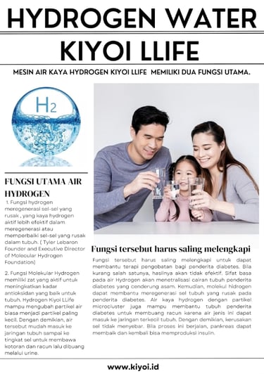 Selain air biasa dengan kandungan pun dinilai punya khasiat yang lebih baik bagi penderita diabetes. Manfaat air hydrogen juga telah diuji secara klinis dan didukung literatur ilmiah. Dalam artikel jurnal berjudul “Anti-Type 2 Diabetic Effect and Anti-oxidation Effect in Active Hydrogen Water Administration KK-Ay Mice” yang tayang di situs Semantic Scholar, di sebutkan bahwa air kaya hidrogen aktif yang diberikan selama 107 hari memiliki efek antioksidan. Air tersebut dapat pula mengontrol kadar gula darah pada tikus percobaan dengan diabetes tipe 2. Anda bisa mengubah air biasa menjadi air kaya hydrogen dengan Mesin Hydrogen Kiyoi LLife . Air biasa diproses secara elektrolisis untuk menghasilkan air hydrogen. Adapun air kaya hydrogen yang dihasilkan Mesin Hydrogen Kiyoi LLife di sebut sebagai Hydrogen Hidrogen Booster karena mengandung banyak molekul hidrogen.