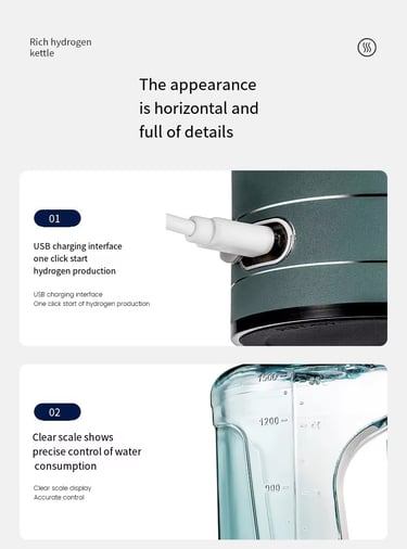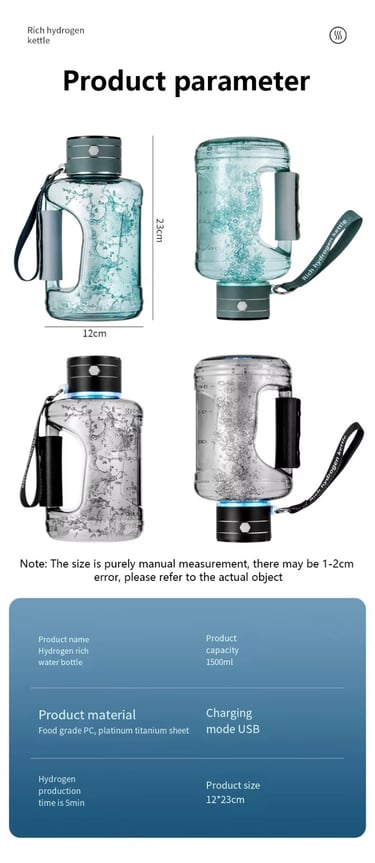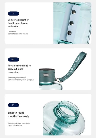 Botol air hidrogen ini dirancang untuk penggunaan luar ruangan dan di mana saja, membuatnya sempurna untuk atlet, wisatawan, dan individu yang membutuhkan air kaya hidrogen di saat bergerak. Produk ini didukung oleh USB, memungkinkan pengguna untuk mengisi dayanya di mana saja.