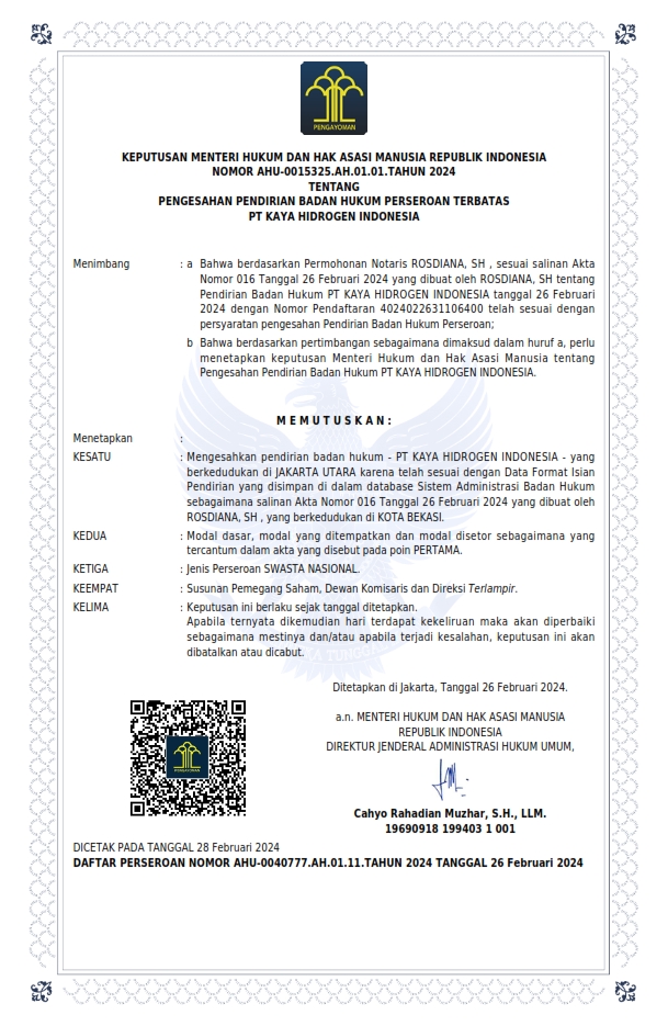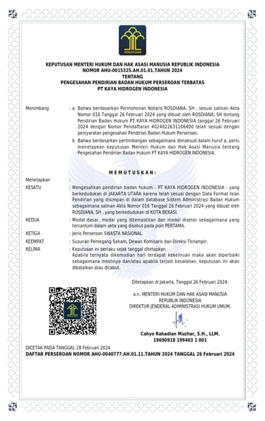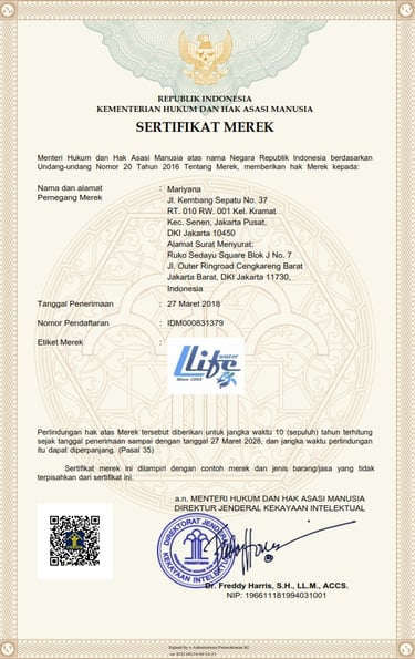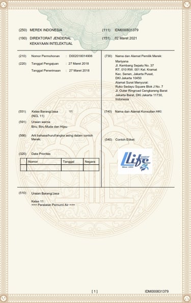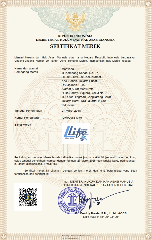 Efektif Tanggal 01 Maret 2024 Penggunaan Hak Merek LLifewater di Kuassakan Hanya kepada PT. KAYA HIDROGEN INDONESIA, saat ini Ibu Mariyana sebagai pemilik hak paten merek adalah sebagai Komisaris di PT.KAYA HIDROGEN INDONESIA